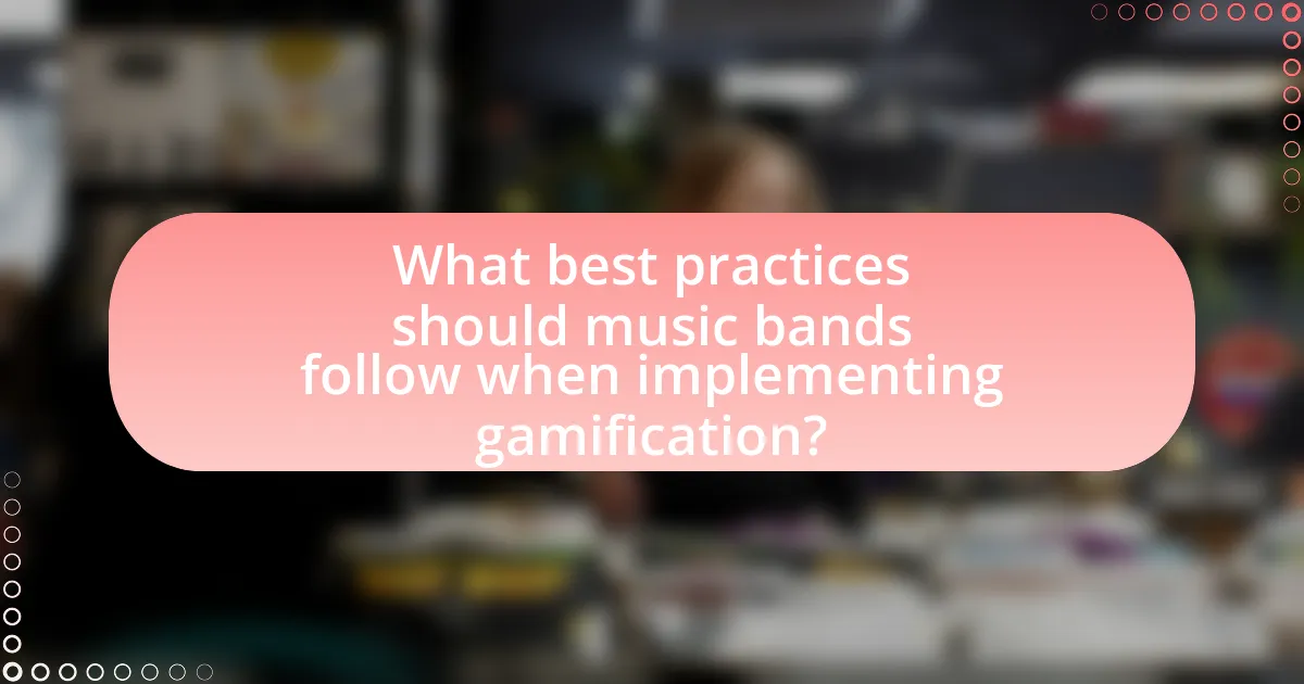 Music bands should prioritize clear objectives, audience engagement, and reward systems when implementing gamification. Establishing specific goals, such as increasing fan interaction or promoting new music, helps guide the gamification strategy effectively. Engaging the audience through interactive elements like quizzes, challenges, or contests fosters a sense of community and keeps fans invested. Additionally, implementing a reward system, such as exclusive content or merchandise for participation, incentivizes fans to engage more actively. Research indicates that gamification can enhance user experience and loyalty, as seen in studies where brands that utilized gamified elements reported a 30% increase in user engagement.